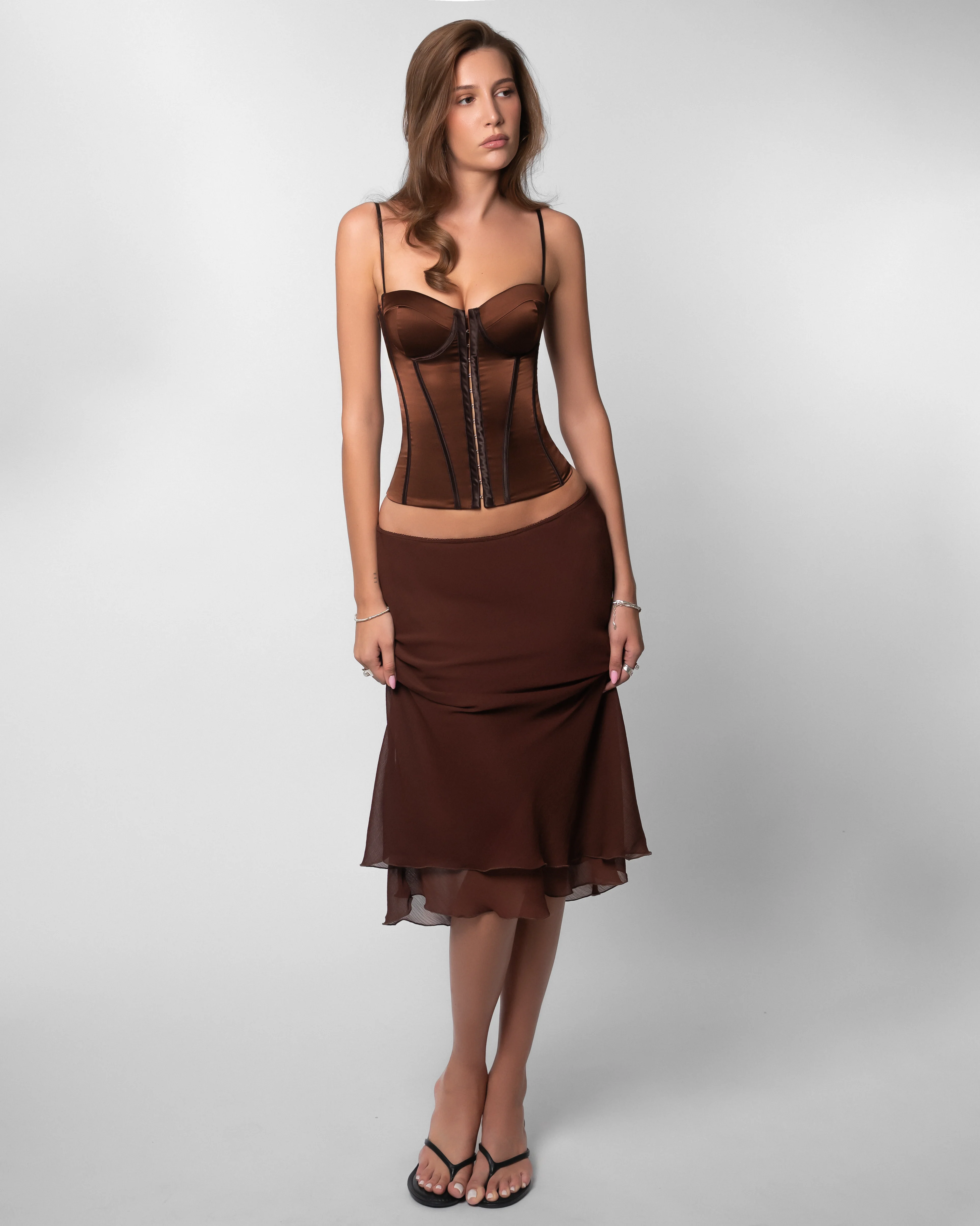 The Naomi Set stands apart in this fall collection as the only warm-toned piece. The brown corset, with hook-and-eye closures, boning and adjustable straps, it’s designed to snatch and lift. As a brand known for its midi skirts, we designed a matching two-layer, flowy, versatile skirt, made to complete the look.