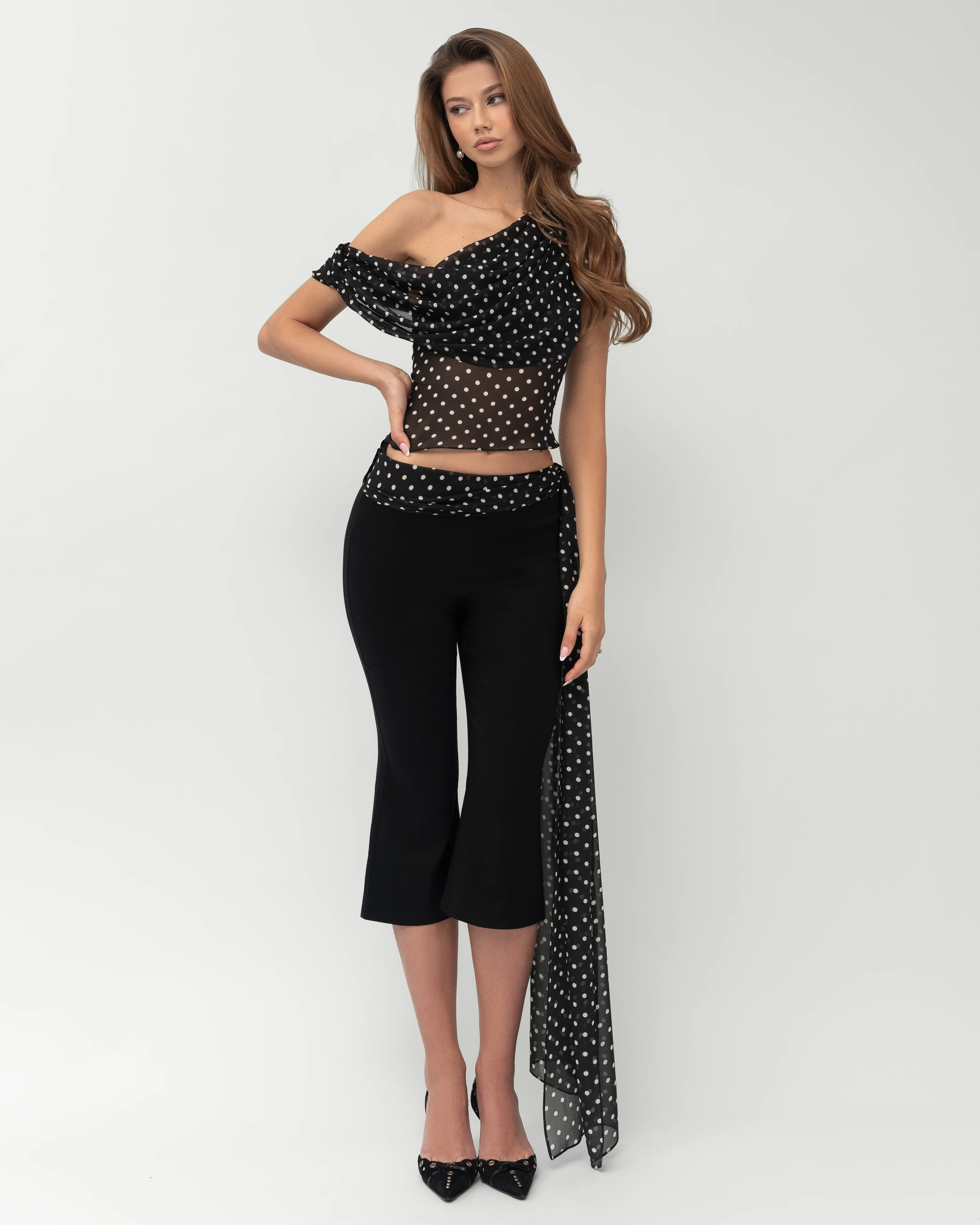 The Paris Top is a chic one-shoulder design with playful polka dots, a side zipper, and an attached matching belt detail that drapes effortlessly. Made with multiple layers for coverage and shape, it’s perfect for dressing up capri pants or black jeans.